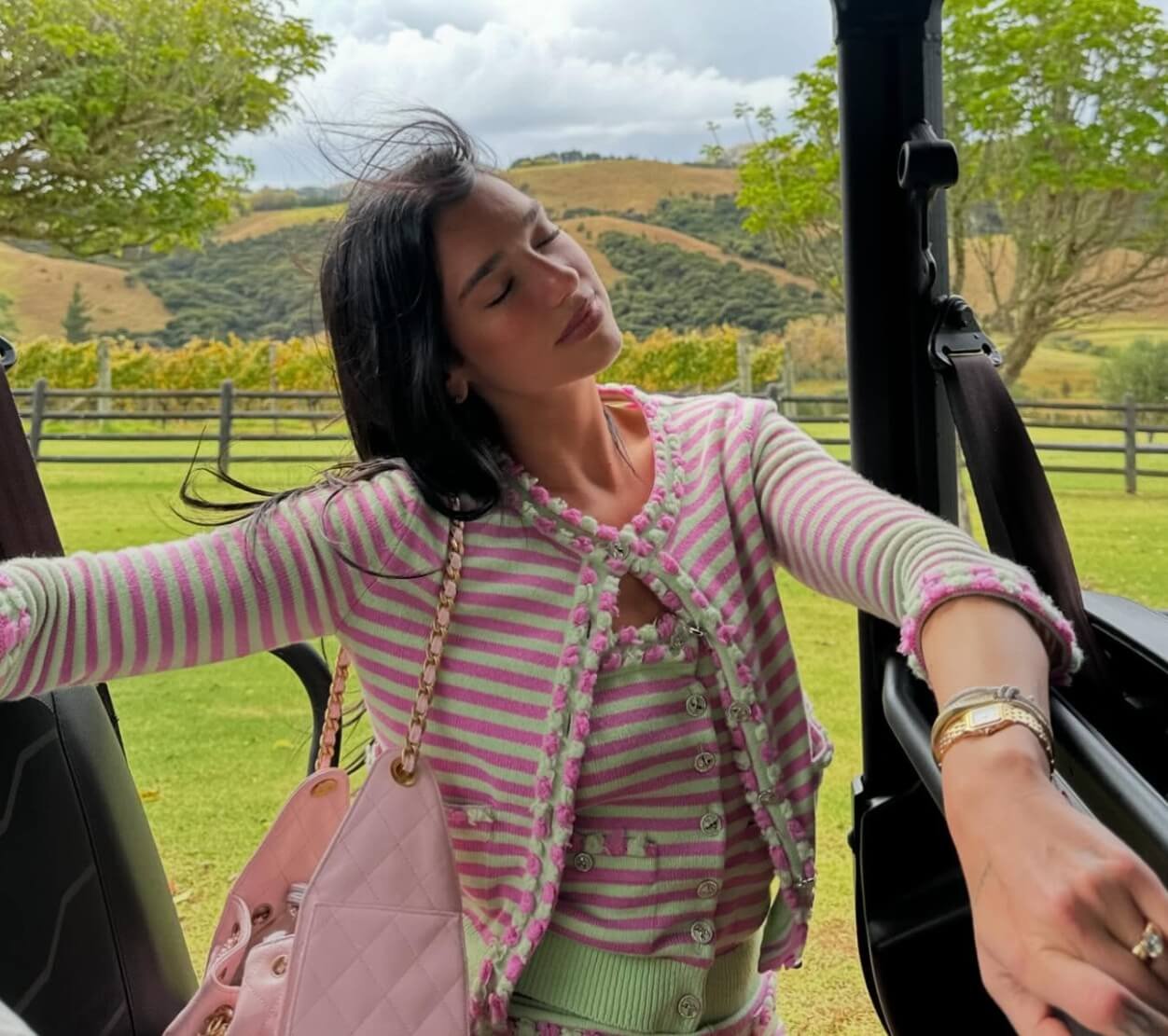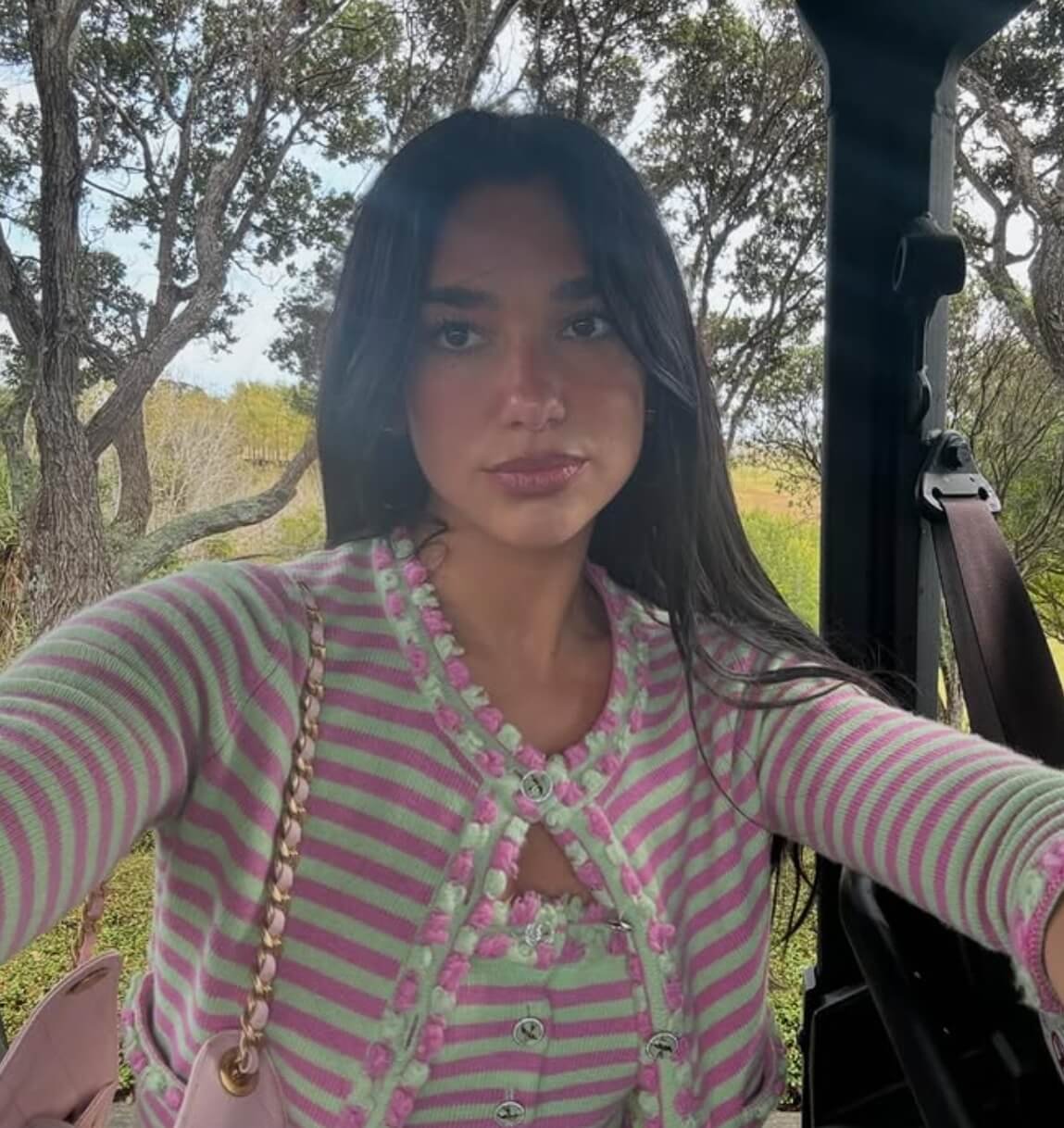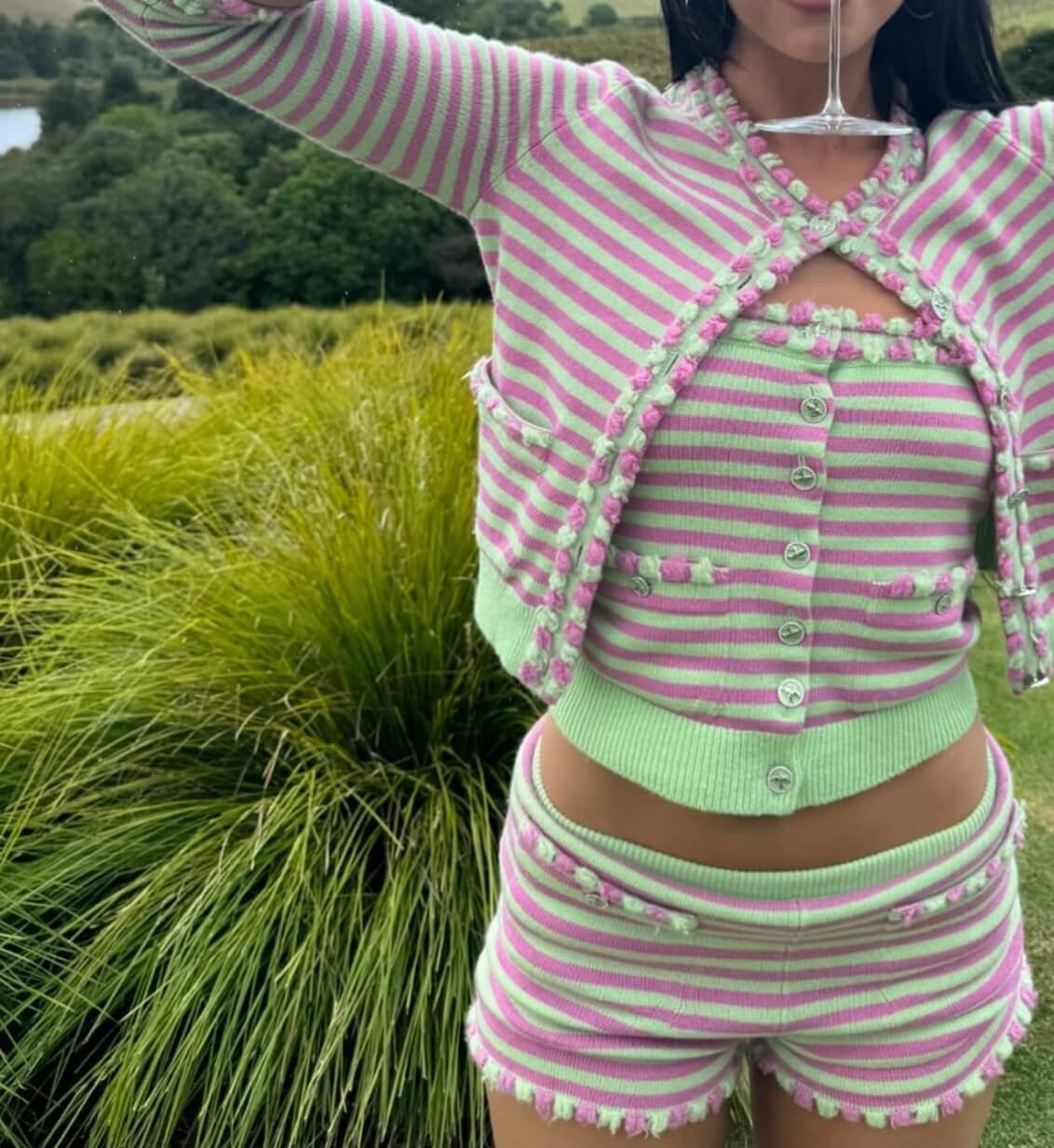 Dua Lipa— Pink striped tank top, cardigan and short—Whole set